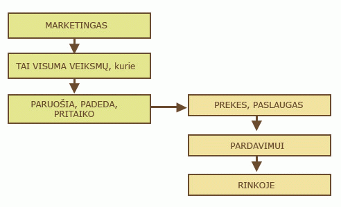Į šį klausimą gali būti keletas atsakymų. Amerikos marketingo asociacija apibrėžia marketingą kaip planavimo, kainų nustatymo procesą, idėjų, prekių ir paslaugų paskirstymą, siekiant sukurti mainus, patenkinančius individų ir organizacijų tikslus. Šią proceso idėją vaizduoja 3.2 pav.