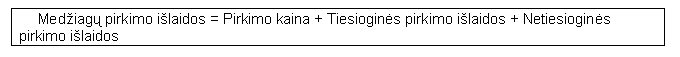 Kaip parodyta 6.1 pav., pirkimo išlaidos apima žaliavų ir medžiagų išlaidas (pirkimo kaina be pridėtosios vertės mokesčio dauginama iš jų kiekio) ir transporto iki įmonės sandėlių bei sandėliavimo išlaidas. Prekybos įmonėse prie prekės pirkimo kainos (pagal kainoraštį) pridedamos atvežimo ir sandėliavimo išlaidos.