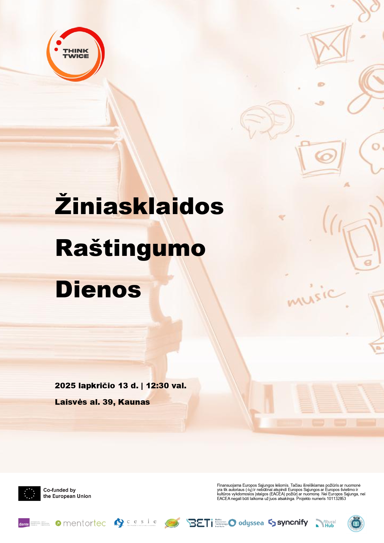 Lapkričio 13 d., 12:30 val., kviečiame dalyvauti ThinkTwice projekto organizuojamame renginyje „Žiniasklaidos raštingumo dienos“. Renginys skirtas mokytojams, jaunimo darbuotojams, edukatoriams ir visiems, kurie nori gilinti savo žinias apie žiniasklaidos raštingumą, kritinį mąstymą ir praktinius mokymo metodus. Dalyvių laukia praktiniai užsiėmimai, pristatymai, diskusijos ir galimybė užmegzti naujų kontaktų. Renginio programa 12:30 – 13:00Registracija. Kava ir užkandžiai.… Tęskite Kviečiame į „Žiniasklaidos raštingumo dienas“ – ThinkTwice projekto renginį! skaitymą