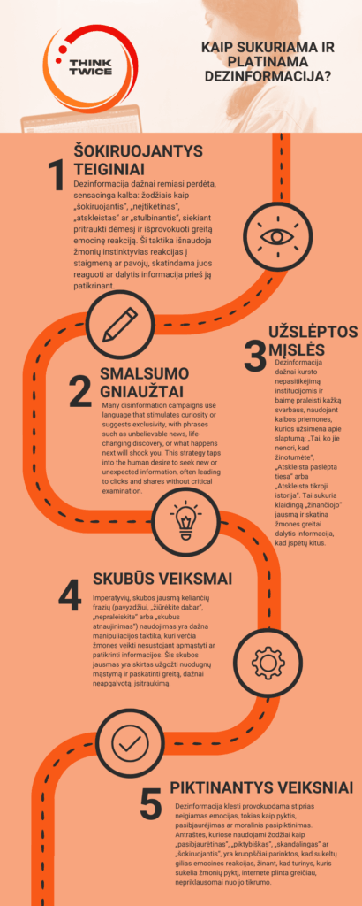 Pirmoji infografika nagrinėja taktikas, kuriomis remiasi dezinformacijos kūrėjai — emocinius dirgiklius ir strategiškai parinktą kalbą, skirtą tam, kad klaidinantis turinys greitai taptų virusinis: