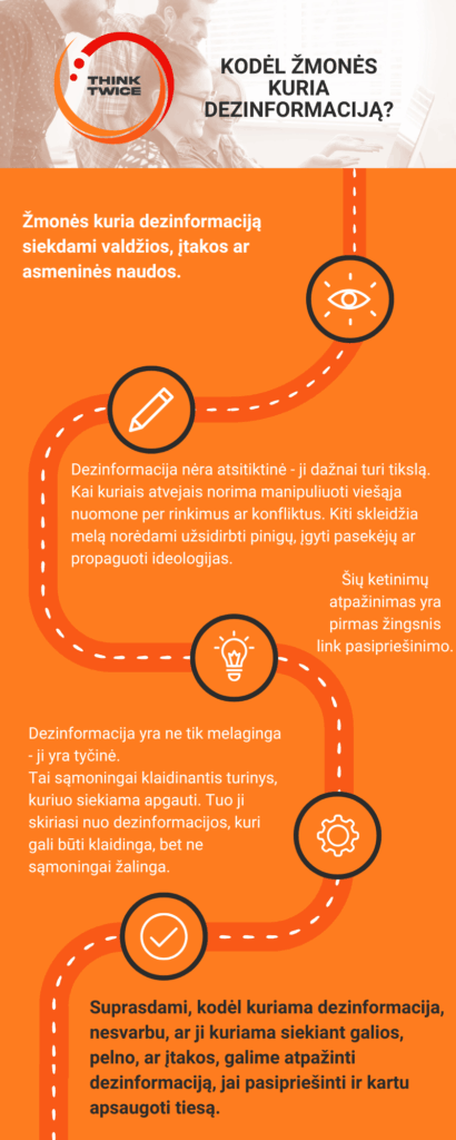 Suprasdami, kaip kuriama dezinformacija, kodėl ji egzistuoja, kokias formas ji įgauna ir kas ją skleidžia, galime apsaugoti save ir savo bendruomenes nuo manipuliacijų.