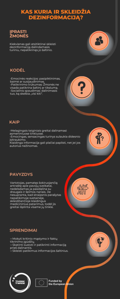 Ši infografika primena, kad dezinformaciją skleidžia ne tik tie, kurie ją kuria — paprasti žmonės dažnai netyčia pasidalija klaidinančiu turiniu.