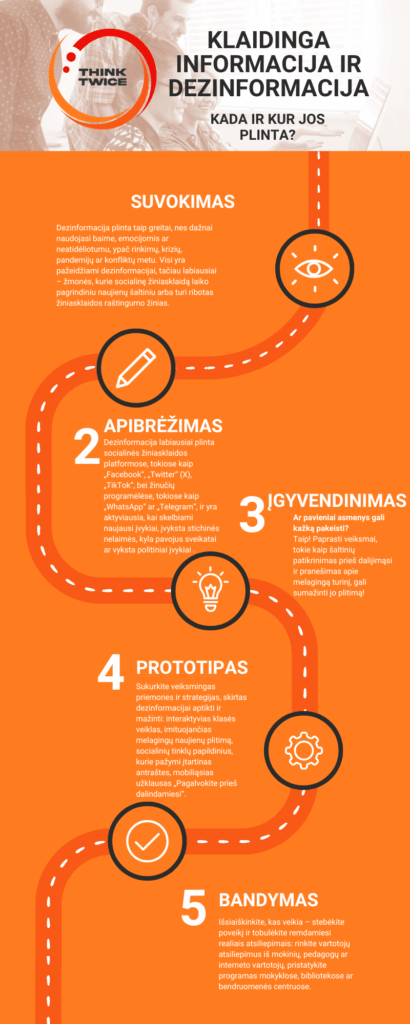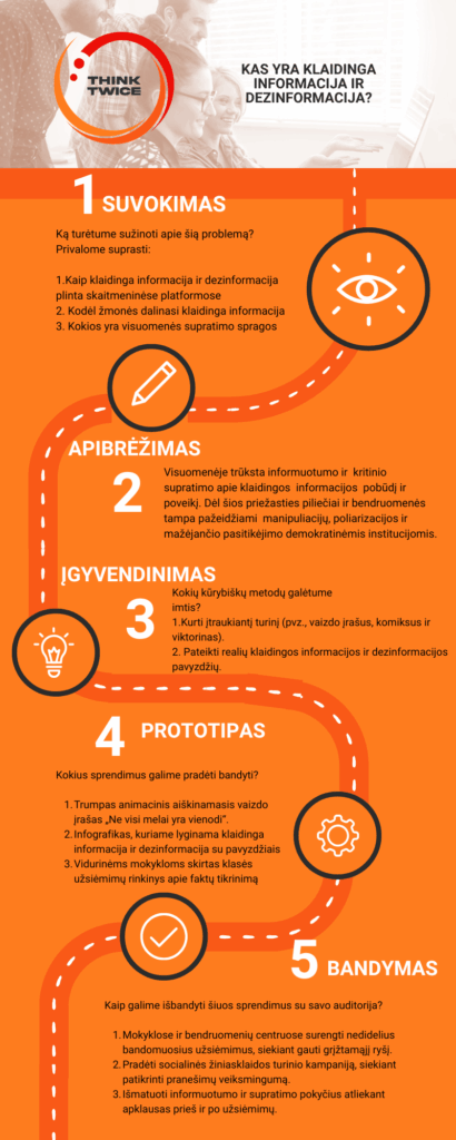 Infografikas veda per etapus: suprasti problemą, apibrėžti ją, generuoti idėjas, kurti sprendimus ir išbandyti juos realiose situacijose.